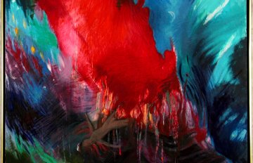 Joyce Wieland, Artist on Fire, 1983. Oil on canvas. 107.2 x 130 cm. Collection of The Robert McLaughlin Gallery, Purchase, 1984.